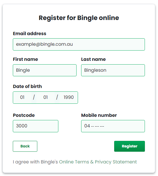 To register for Bingle Self-Service, follow this link and fill out your details in full. Please ensure these details are identical to your policy. An example of the page can be seen below: